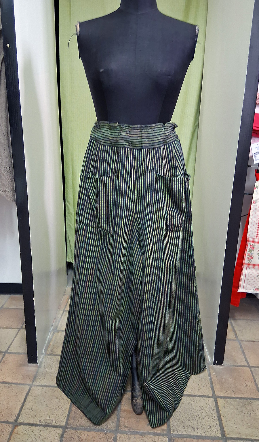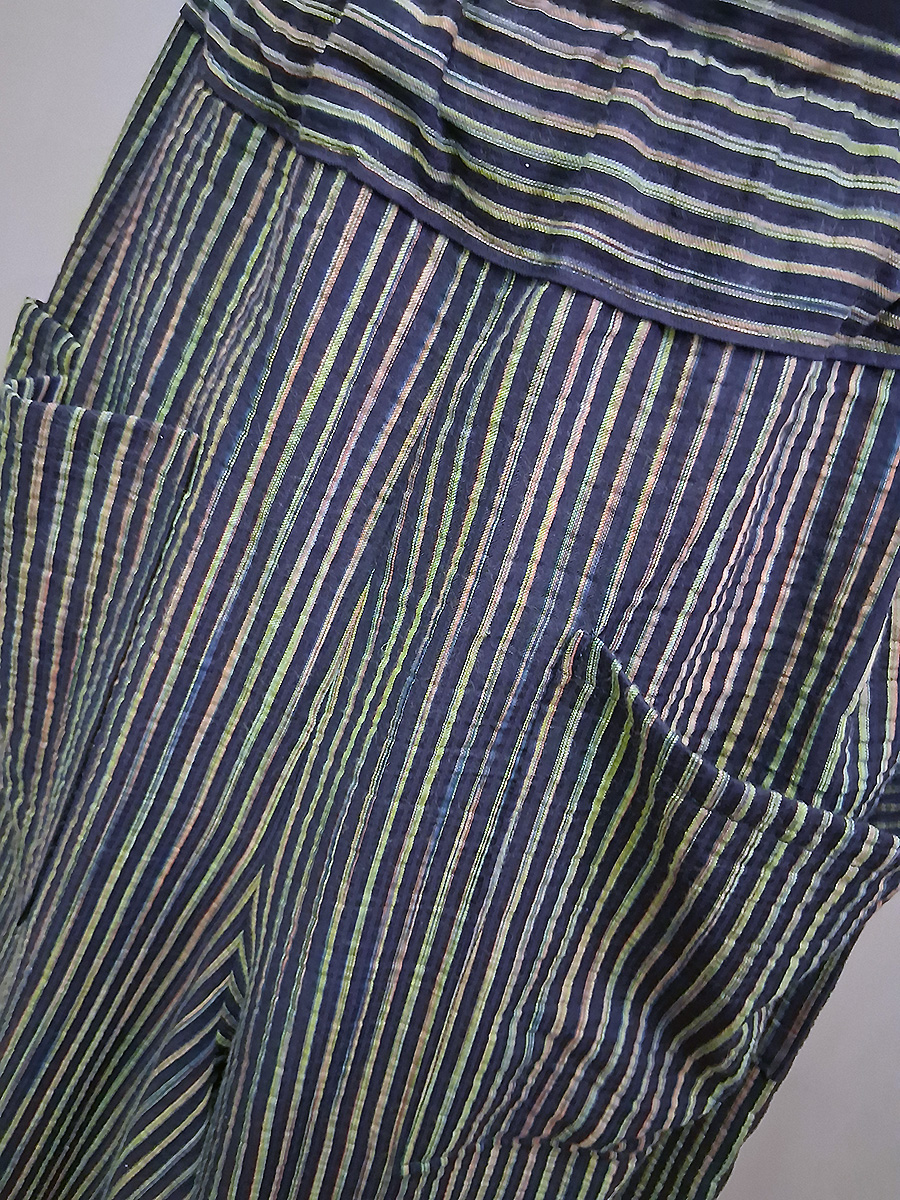 Pantaloni a zampa di elefante in puro cotone, tasche sul davanti, fascia con elastico in vita, circonferenza max cm. 100, fatti a mano e pezzo unico.