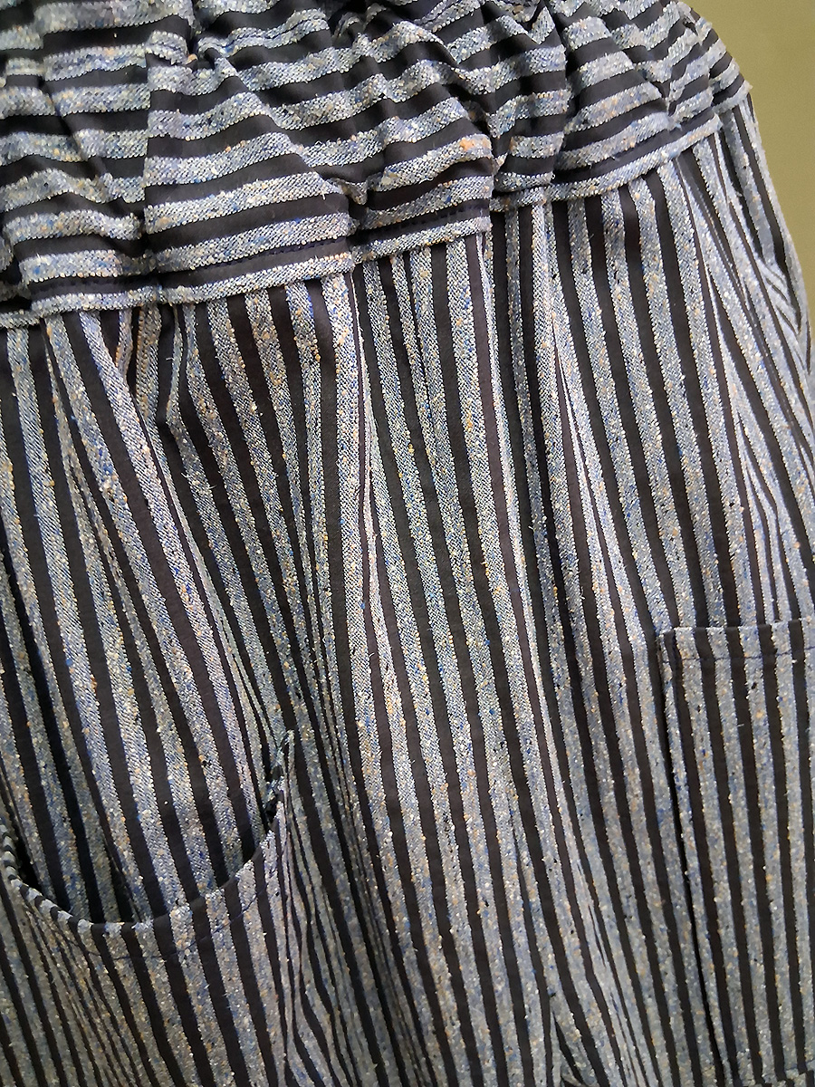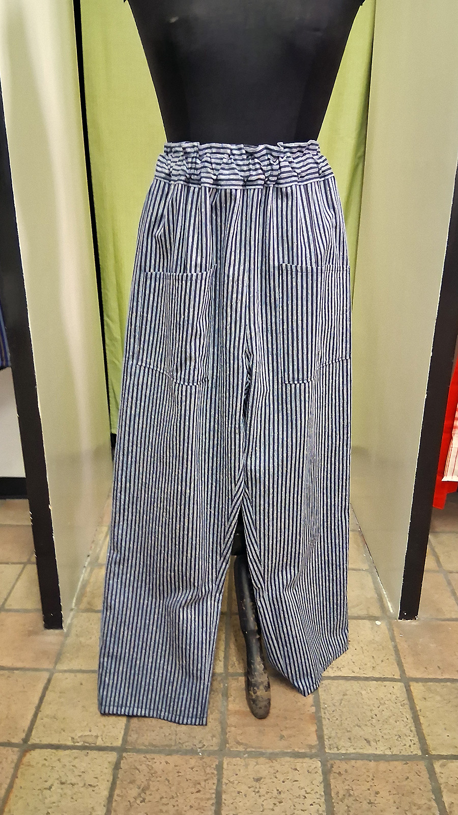 Pantaloni in puro cotone, tasche sul davanti, fascia con elastico in vita, circonferenza max cm. 100, fatti a mano e pezzo unico.