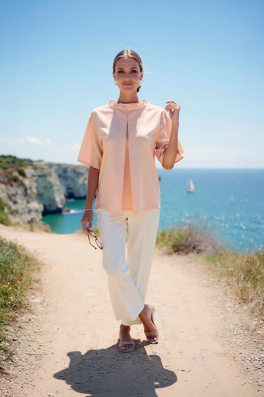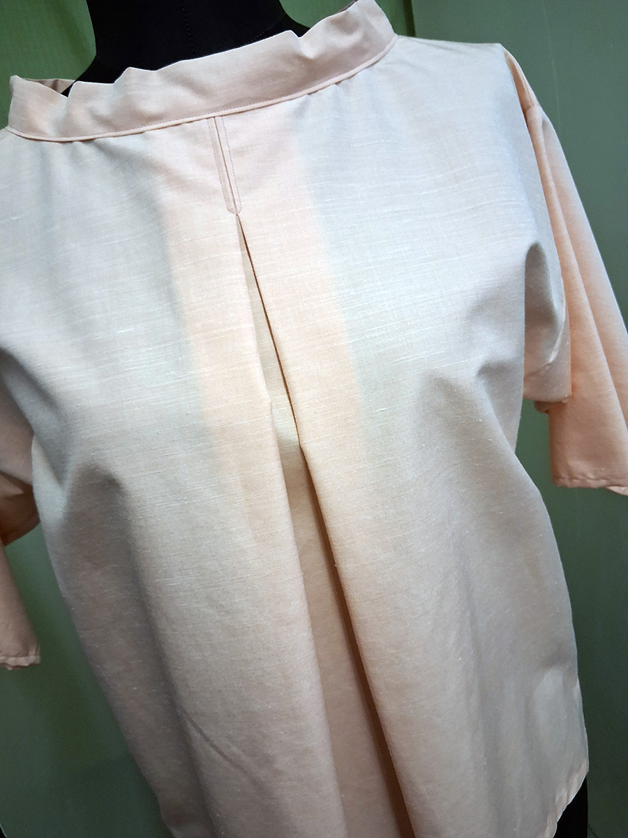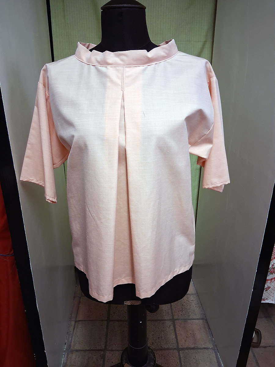 Comoda camicetta in puro cotone, con possibilità di indossarla sia sul davanti e che sul dietro, collo a barchetta, taglia M, fatta a mano e pezzo unico.
