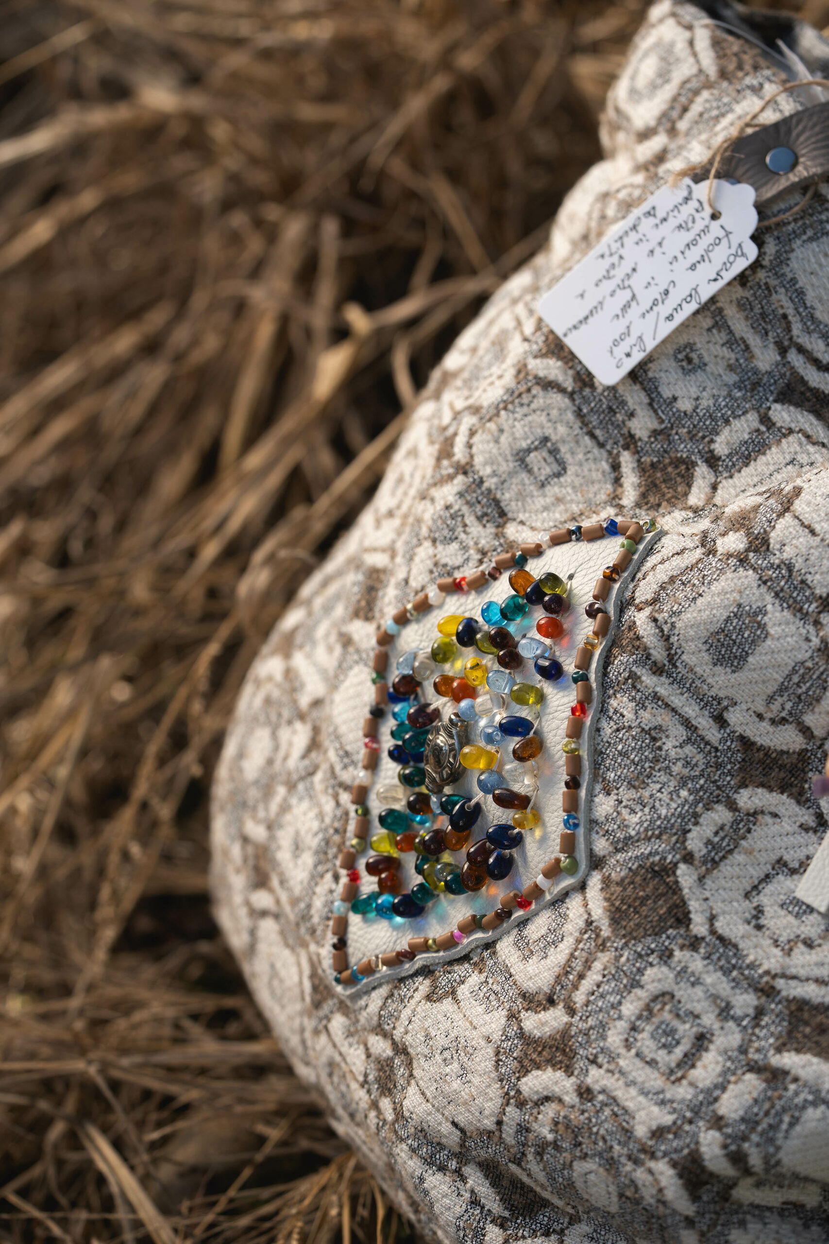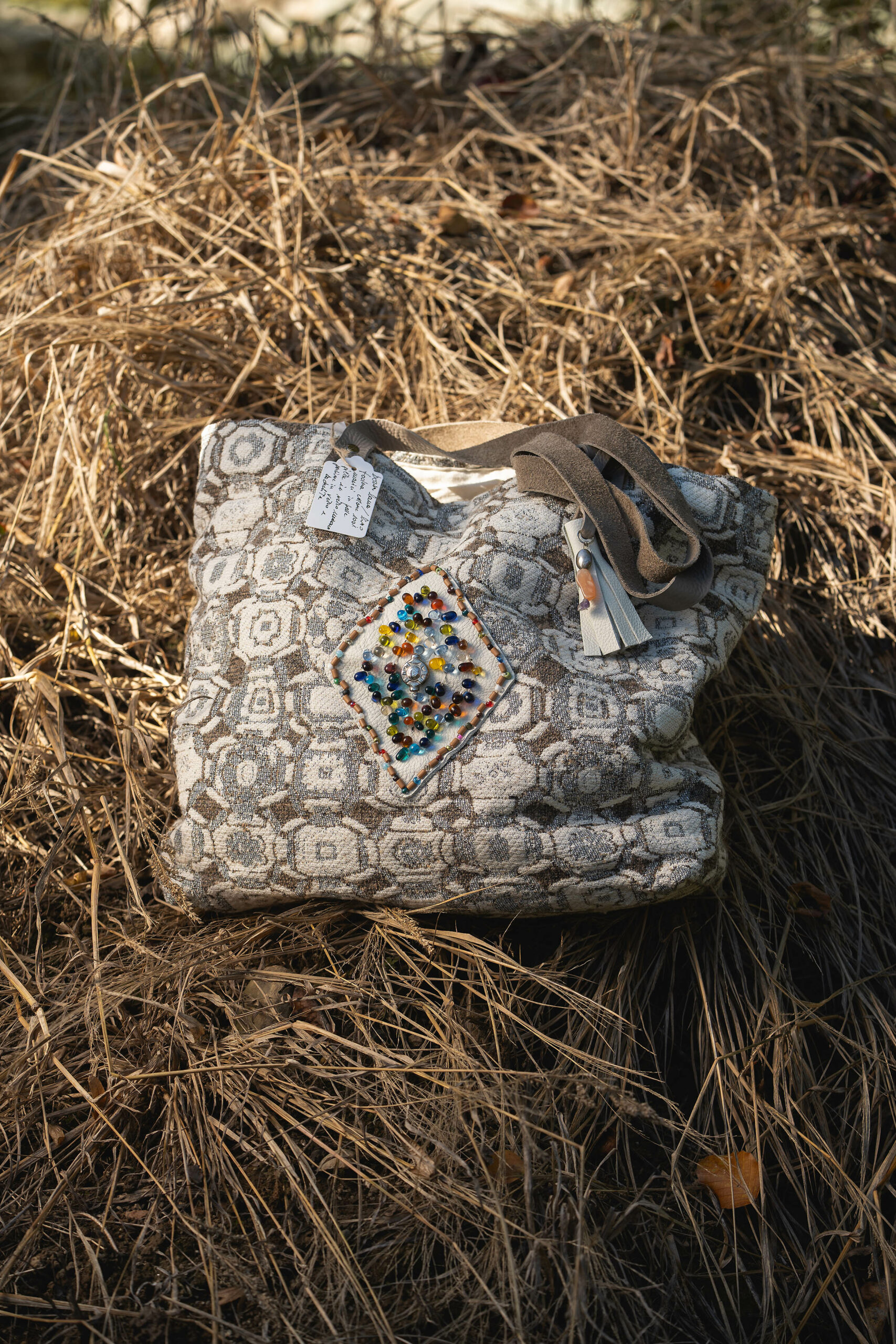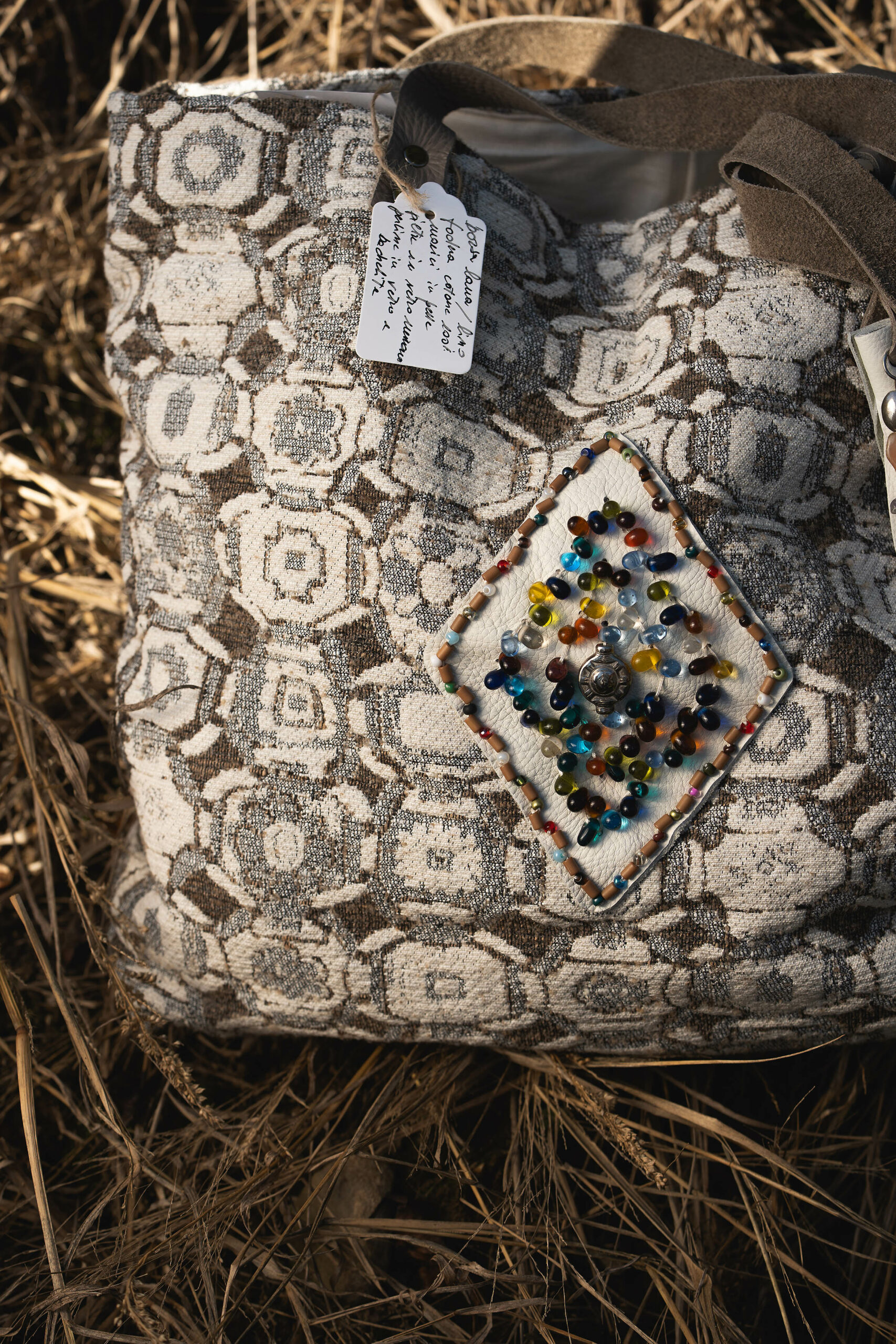Borsa in tessuto operato lana/lino/cotone con decoro pietre in vetro murano su pelle, interamente foderata con tasca interna, chiusura a secchiello, manici a spalla in pelle eseguita interamente a mano.