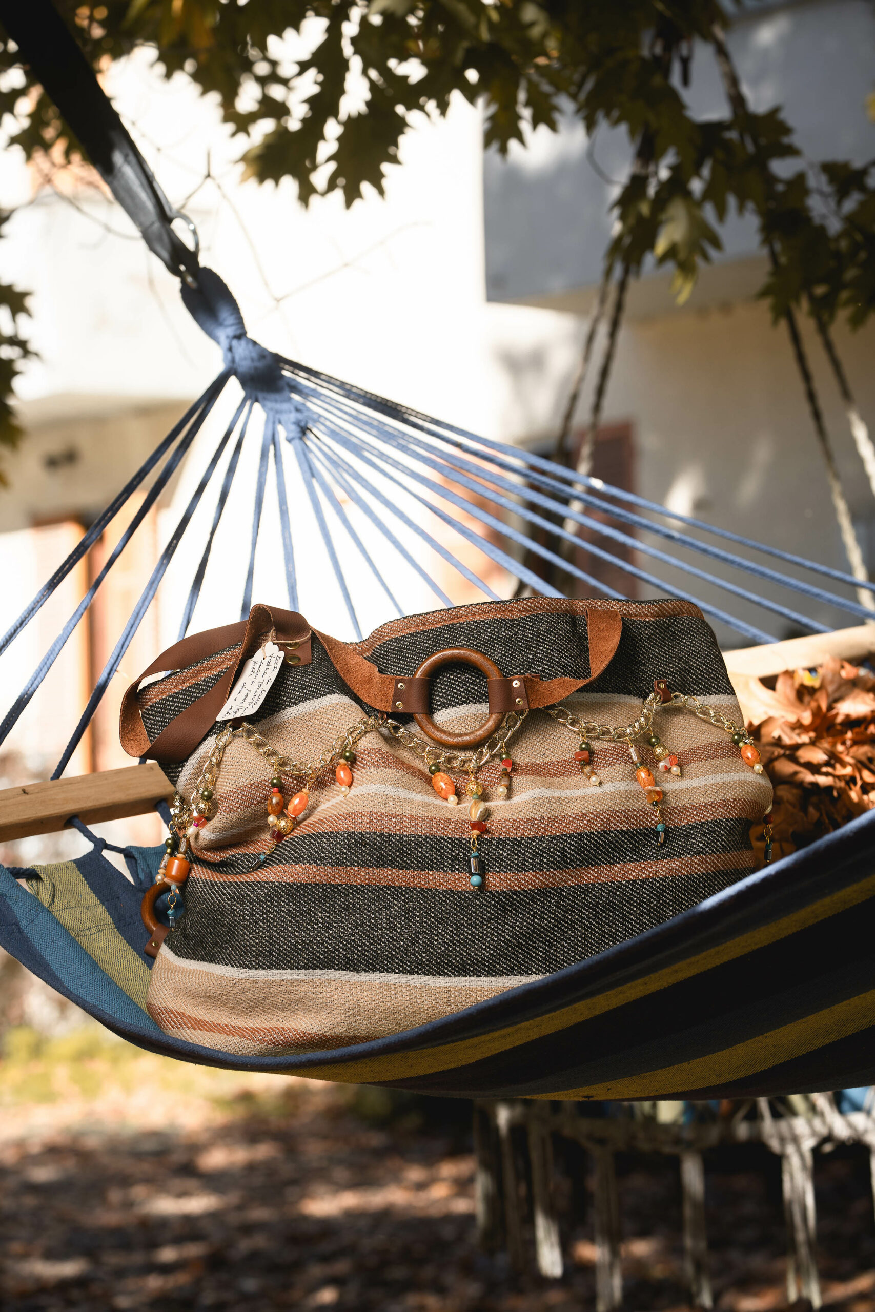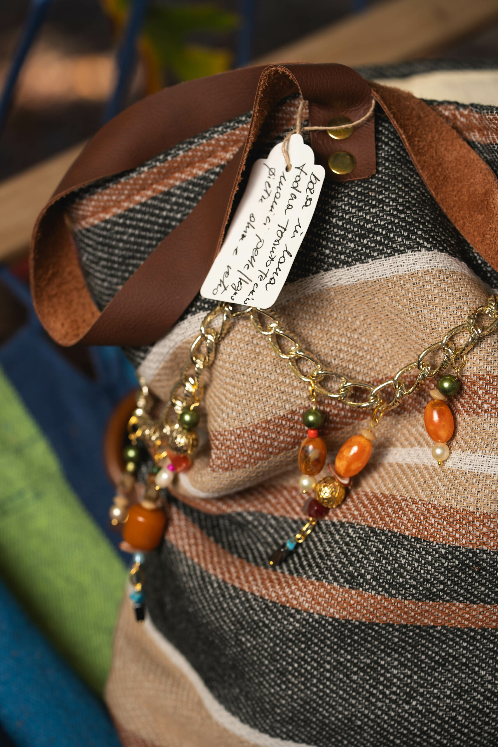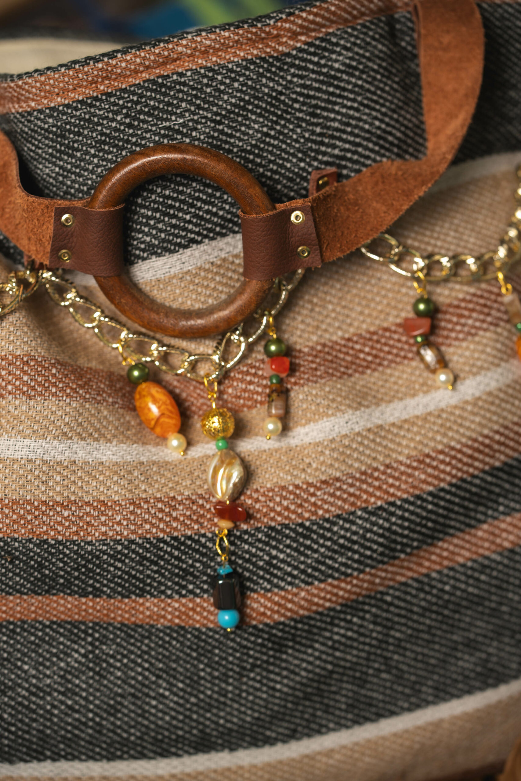 Maxi bag in tessuto di pura lana, interamente foderata con tasca interna, chiusura a secchiello e manici a spalla in pelle e ciondoli in pietre dure. Interamente fatta a mano.