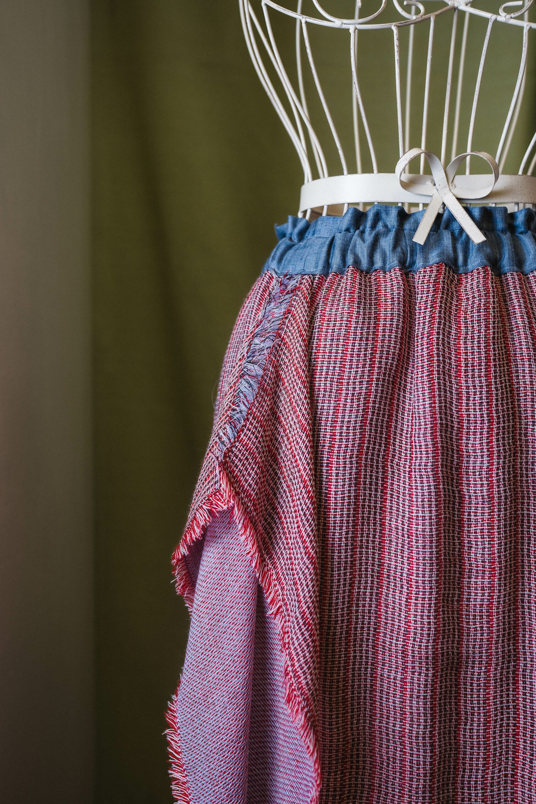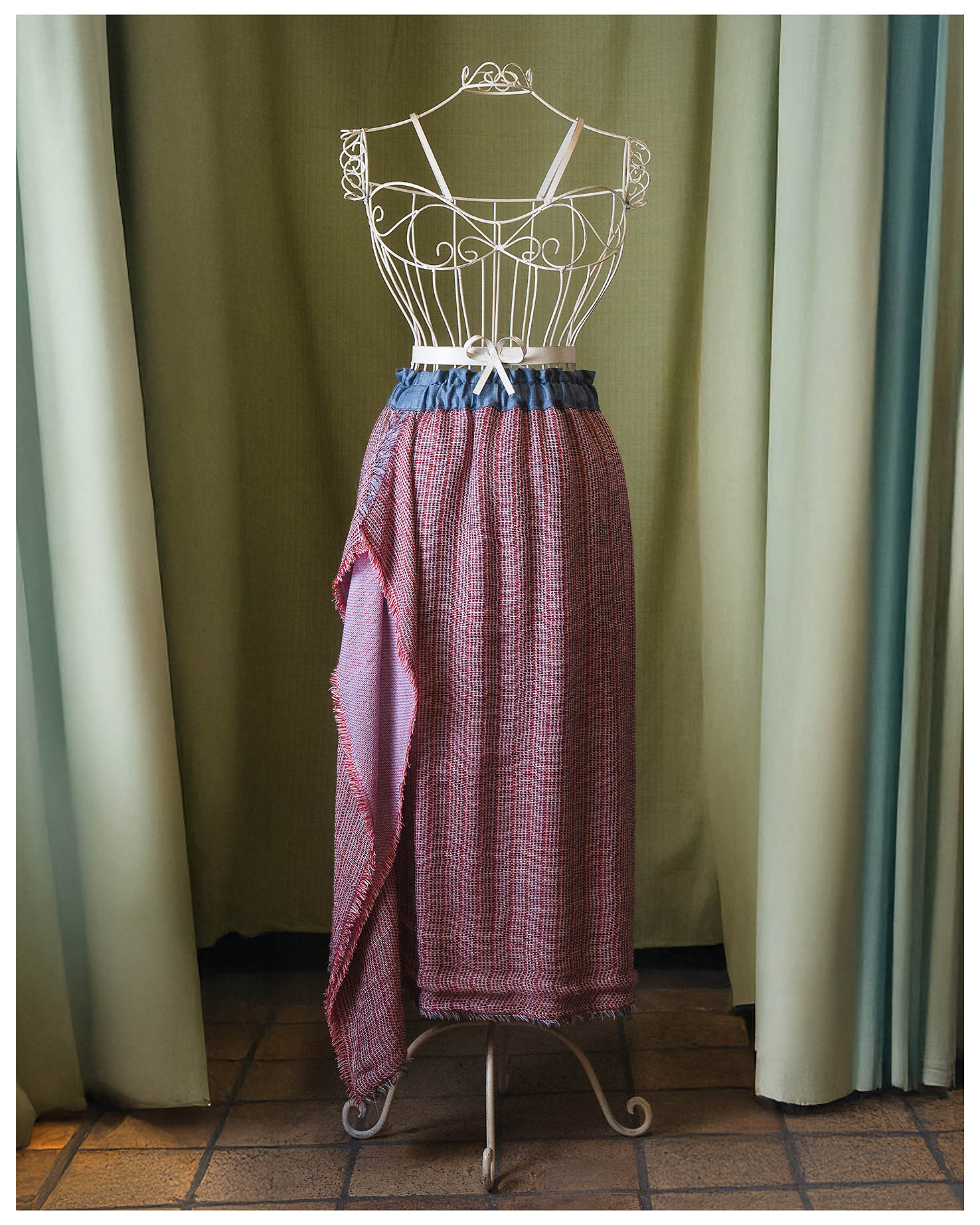 Gonna in tessuto a garza di pura lana con drappeggio su un lato, bordi a sfrangio, fascia con elastico in vita circonf. max cm. 102. Pezzo unico. Spedizione gratuita.